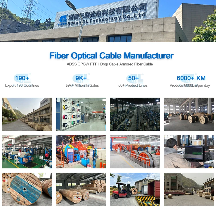 ndary plastic coating equipments, 15 sets of SZ layer twisting equipments, 16 sets of sheathing equipments, 8 sets of FTTH drop cable production equipments, 20 sets of OPGW optical cable equipments, and 1 paraeling equipment And many other production auxiliary equipments. At present, the annual production capacity of optical cables reaches 12 million core-km (average daily production capacity of 45,0o0 core km and kinds of cables can reach 1,500 km). Our factories can produce various types of indoor and outdoor optical cables(such as ADSS, GYFTY, GYTS, GYTA, GYFTC8Y, air-blown micro-cable, etc.). the daily production capacity of common cables can reach 150oKM/day, the daily production capacity of drop cable can reach max. 120okm/day, and the daily production capacity of OPGW can reach 20oKM/day. Cooperated Areas GL Fiber company's products are exported to more than 169 countries and regions in America, Eastern Europe, Africa, the Middle East, Southeast Asia, and South Asia. The company establishes a long-term strategic partnership with China State Grid Corporation, China Southern Power Grid Corporation, China Telecom, China Unicom, China Mobile, SARFT, China Railway and lots of foreign natio